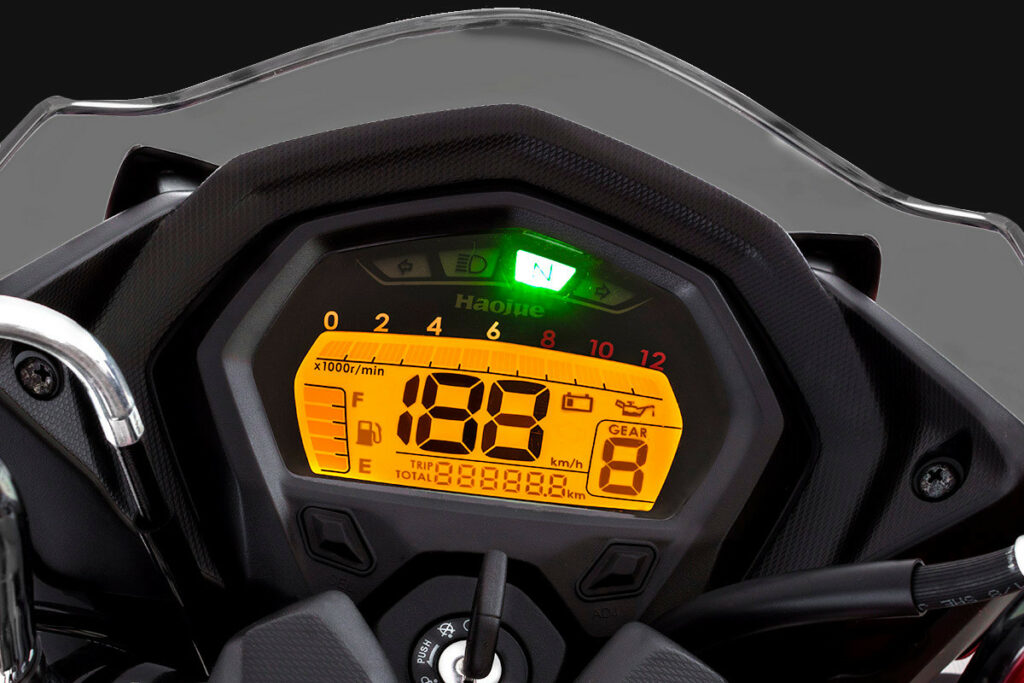 A Haojue destaca a aceleração rápida, baixa geração de ruídos e de vibrações e o poder nas subidas como os pontos fortes da motorização.
