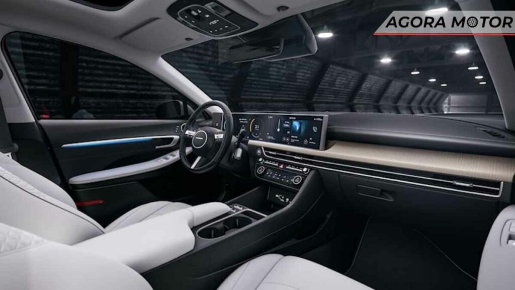 Na cabine, há uma tela curva panorâmica que combina perfeitamente telas duplas de 12,3 polegadas, controles climáticos do tipo toque e um controlador shift-by-wire do tipo coluna montado atrás do volante.
