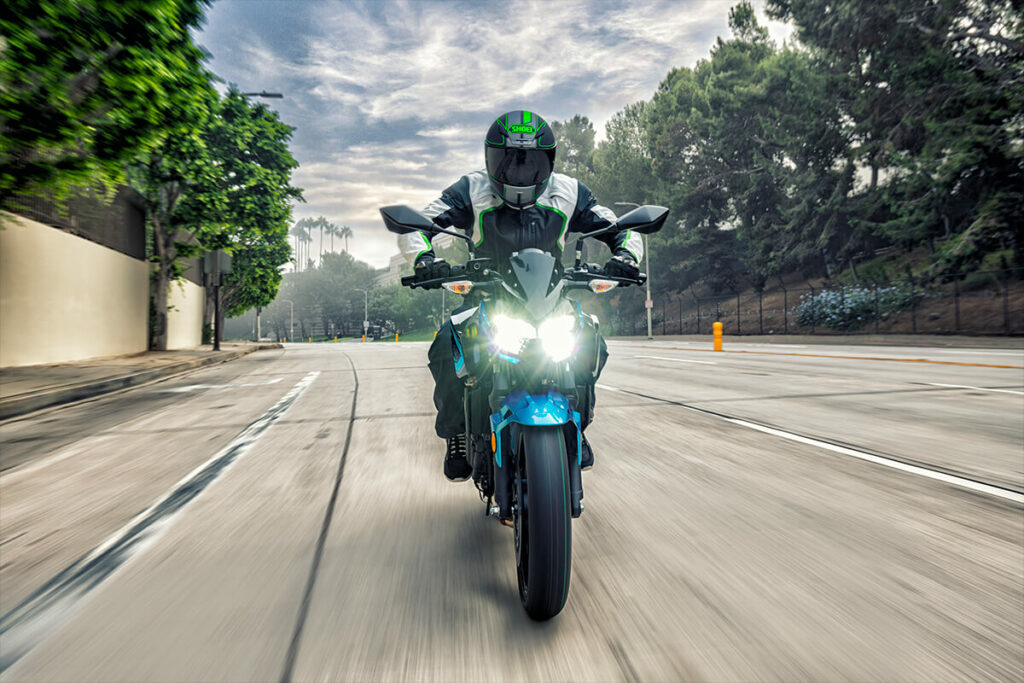 • estilo agressivo de streetfighter: as linhas que compõem o estilo da Z400 formam ângulos pontiagudos que atribuem um visual afiado e imponente à motocicleta.
