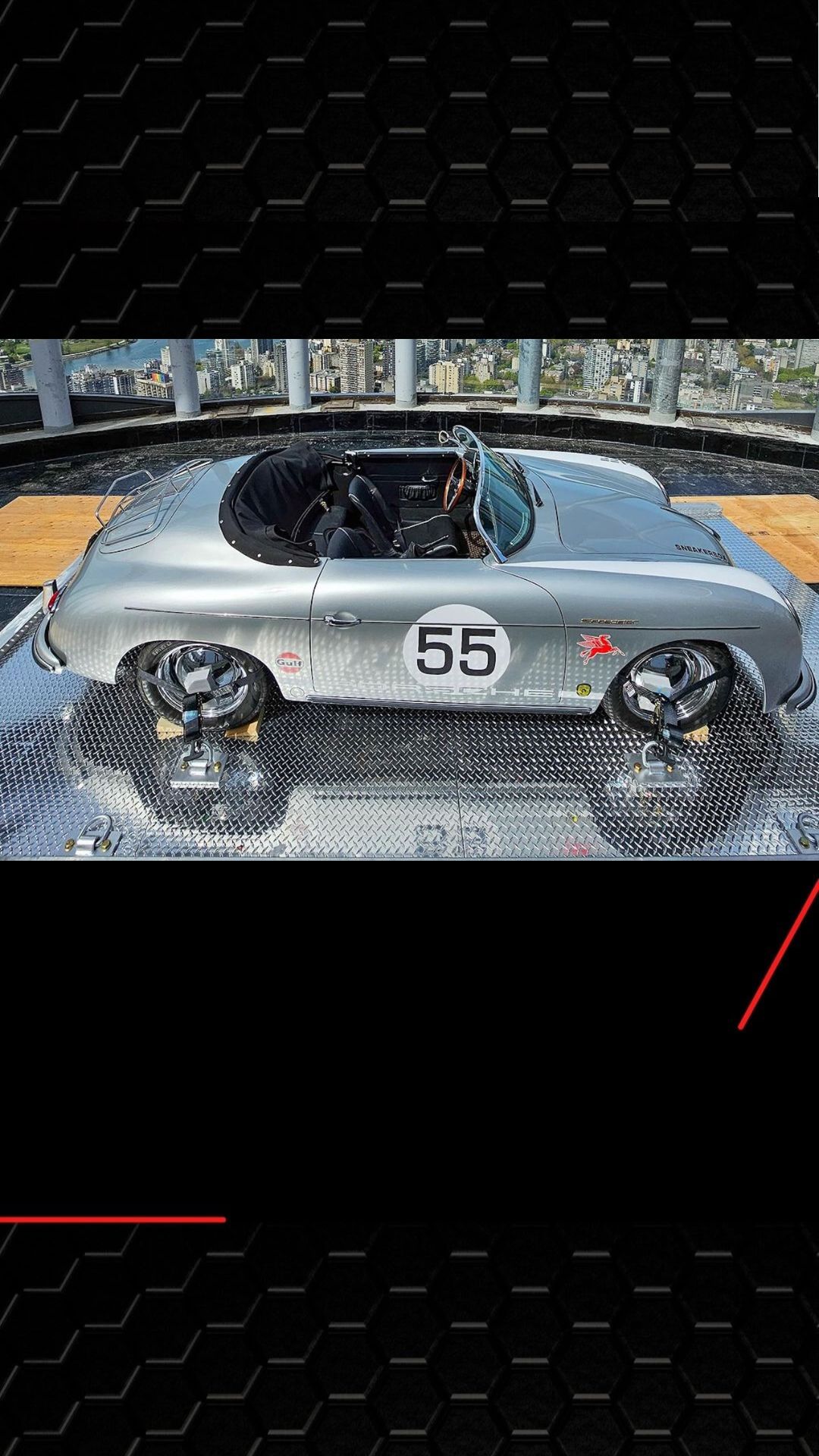 Porsche 356 Speedster 1957 é içado por guindaste até a cobertura do luxuoso edifício Butterfly em Vancouver, onde ficará na sala do condomínio com vistas panorâmicas da cidade.