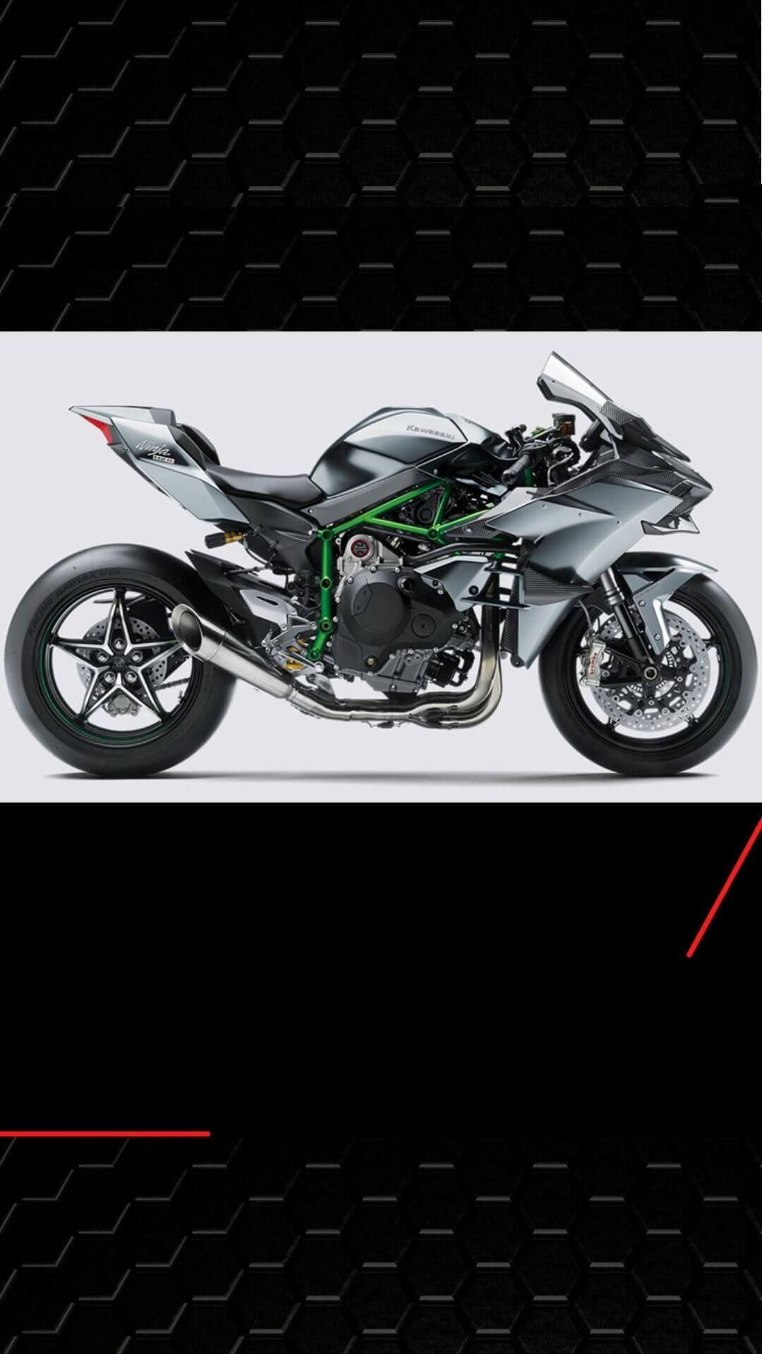A Kawasaki Ninja H2R pode gerar uma potência de até 326 cv de potência de um torque de 16,8 kgf.m, além de contar com um motor de 998 cc e 4 cilindros.