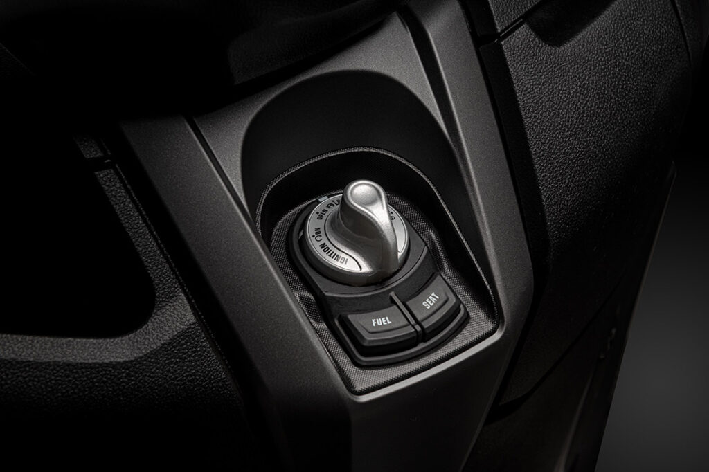 Essa mesma chave de presença funciona para abrir o tanque de combustível e para abrir o banco, para acessar a mala de transporte. A moto também tem agora o sistema chamado Stop & Start. Com ele, em paradas a partir de 1,5 segundos, o motor é desligado.